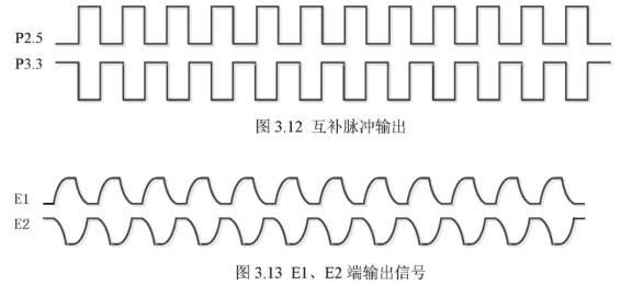 在空管检测时,单片机引脚P2.5和P3.3分别输出互补对称的脉冲,脉冲频率为200Hz,其输出波形如图3.12所示,脉冲串经过电阻电容组成的电路后,在E1、E2端得到如图3.13所示的波形信号。在空管时,电极裸露在空气中,电极信号处于悬空状态,差分放大器两同相输入端由于没有直流偏置会使运放输出电压不稳或出现饱和。当施加空管检测脉冲时,差分放大器的两个运放会处于饱和状态,单片机的内置A/D采集到的信号也是饱和的。而当传感器处于满管状态时,差分放大器的两个同相输入端会有直流偏置,此时运放工作于放大状态,即使施加空管检测脉冲,进过分压,电容隔直滤波后,运放远不会达到饱和状态,与空管时得到的信号幅值可以明显的区别开来。同时,为了防止磁场在电极上产生感应电动势,影响信号检测,在空管检测时电磁流量计传感器不施加励磁磁场。 |