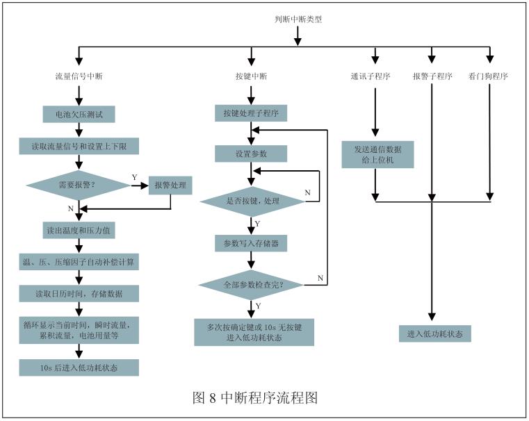 系统的应用程序主要是由主程序和中断处理程序组成,其中主程序又由多个子程序所组成。主程序包括:系统初始化子程序、电池测试子程序、数据处理子程序、循环显示子程序等;中断处理子程序包括:流量检测子程序、温度压力检测子程序、流量补偿算法子程序、按键输入子程序、存储配置数据子程序、通讯子程序等。