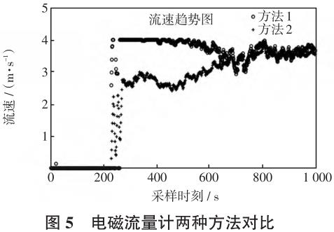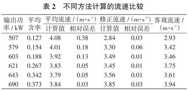 图5显示电磁流量计测量的瞬时流速(对应方法1)近乎平缓,由于输出功率的增加幅度并不足够大,使得电磁流量计本身的输出不能反映出整个舱内泵输出功率导致的实际流速的增加,而且由于整体含率逐渐增加,输出流速甚至有下降趋势。这与实际工况和经验不符,因为含率的增加不可能根本改变流速的变化趋势,而使用本文方法计算得到的流速(对应方法2)有明显上升趋势,并在舱内泵输出功率稳定时趋于平稳,与舱内泵的输出功率基本一致。
