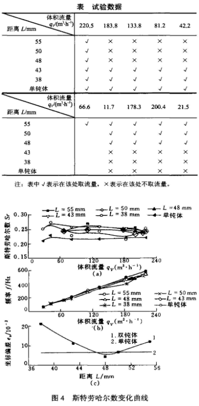 由4b图,该曲线的线性度与斯特劳哈尔数标准偏差相对应,当L=50~46mm时双钝体流量--频率曲线的线性度较好。