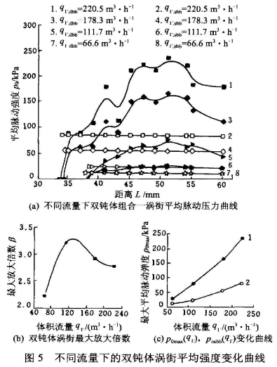 图5a是试验得到涡街的程度在不同组合在不同流量下的比较曲线,图上的P0是通过`y换算而.来的,可以认为是涡街的平均脉动强度。