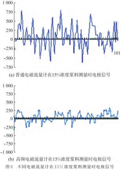 当纸浆浓度为3%~15%时,浆料中液体的不均匀以及浆料摩擦电极引起的高频噪声,容易使得电磁流量计波动,因此,需选择励磁频率≥25Hz的高频励磁。根据我公司高频电磁流量计的使用经验,高频励磁可降低40%~50%的流量波动幅度,如图6所示。
