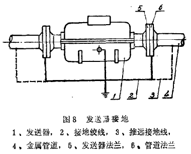 2.接地要求地线应该用总直径1-2以上毫米铜绞线接在埋于一定深度的接地棒或接地纲.上(深度根据不同地区实际情况而定,上海-般埋于一米多些深度潮湿的地方就可以了)。接地装置与发送器的距离尽可能地短,除发送器接地外,连接发送器的金属管道的法兰也要接地,如图8所示。某冶炼厂用电磁流量计测量碱液矿浆,按照上述要求接地,但是干扰讯号还是较大,不能正常运行,后来他们试把金属管道再接地(见图8虚线)试把接地点逐步向外推远,当推远到2米时,干扰讯号显著下降,才使仪表能正常运行。这种情况说明他们管道上杂散电流较大,电流通过管道以及管道内液体影响到发送器。当管道上接地点向外推移,杂散电流影响不到发送器的探测电极上,排除掉干扰讯号,才能使仪表正常运行。