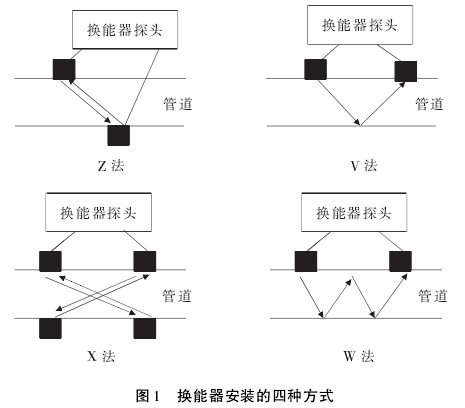 换能器安装方式通常有Z法、V法、X法、W法等,应根据使用说明书并结合现场条件选择最恰当的安装方式,换能器安装方式示意图如图1所示。例如,当流体平行于管轴流动时,通常可采用Z法;当流体流动方向与管轴不平行时,可采用V法或者X法;当管道长度有限时,使用X法可获得较好的精度等。目前,可测的最小管径为φ25mm,采用V法或W法以扩大声程长度,增加顺逆向声传播时间。而乙法一般用于φ50mm以上管道。