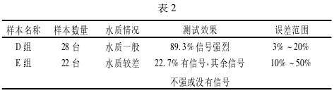 当然除了管径这一大因素外,污水水质的好坏也是一个影响检测效果的原因。把受检的50台流量计所流过的水质分为两组,水质一般D组和水质较差E组。整理数据见表2。