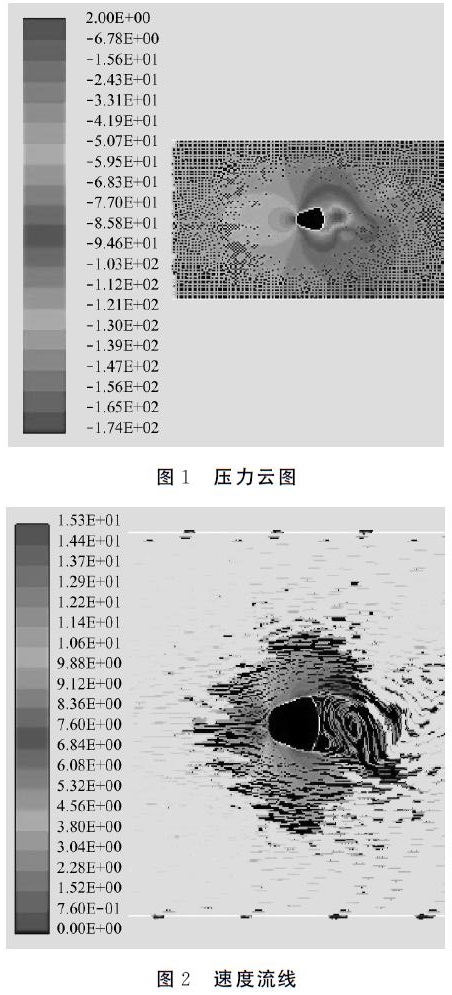 威力巴流量计由于其独特的传感器结构,相较其他均速管流量计,其防堵性能大大增加。图1、图2分别为用Fluent流场模拟软件仿真的威力巴流量计在管道中的压力云图和速度流线图。模拟管径为DN250,流体介质为空气,流速为0~10m/s。