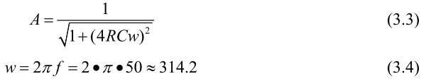 设计中,输入通道采用2级阻容低通滤波器,采用对称结构,以保持电路平衡,如图所示。如前所述,变送器励磁频率是(50/8)Hz和(50/2)Hz两种,综合考虑噪声抑制和有效信号的频率响应,选择电阻,电容使50Hz的串模干扰信号衰减43至1/600左右。电路参数计算方法可按幅频特性公式进行计算:A为信号衰减比,R、C为滤波电路参数,ω为信号角频率。
