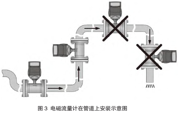 当被测流体中出现气、水混合或管路中出现气体聚集时,会增大测量误差,因此严禁在管道的最高点或在向下排空管道的上方安装电磁流量计,存在容易发生气体积聚或形成气泡的风险。通常,最佳安装位置是管道低点(如可能出现沉积物聚集,需要设置泄放口)以及水流向上的竖直管道上,如图3所示。