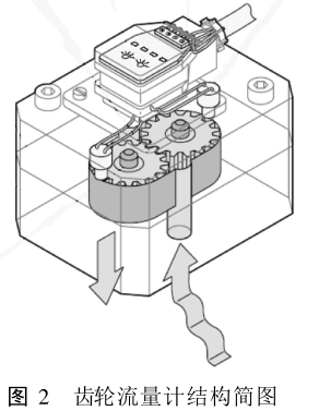 椭圆齿轮流量计属于容积式流量计.齿轮流量计结构简图见图2.其工作原理为:流体在上游的压力作用下进入流量计,推动一对啮合的圆柱齿轮转动.齿轮的齿顶圆和端面与壳体底座及壳体上盖之间的间隙非常小,齿轮在转动过程中,轮齿把流动的液体连续不断地分割成单个的体积单元,每个体积单元等于两个轮齿的容积.齿轮每转动一个齿距的角度,排出等于两个轮齿容积的流体体积.在壳体上盖对应测量齿轮分度圆处安装两个电磁转速传感器,齿轮转动时,轮齿每次经过电磁转速传感器,流量计发出一个电脉冲信号.根据流量计发出的脉冲数可以测量流体的流量.