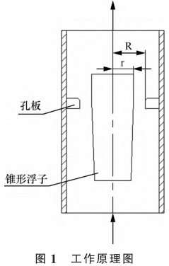 金属管浮子流量计的工作原理如图1所示,流体自下而上流经孔板与锥形浮子形成环形流通面积时,因流体被节流,锥形浮子上下游两端产生压差,锥形浮子受此压差影响形成一上升力。当上升力大于浸在流体中锥形浮子重量时,锥形浮子就会上升,此时环形流通面积随之增大,流体流速随之下降,锥形浮子上下两端压差降低,上升力也随之减小,当锥形浮子受到的作用力达到平衡时,便会稳定在某一高度。由锥形浮子上升高度确定的环形流通面积与流量成正比,因此检测此位置就可以求得流量。
