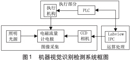 电磁流量计电极识别系统由图像采集、运算处理、执行部分3部分组成,系统框图如图1。系统为相机配备一个照明光源,保证电磁流量计电极附近的亮度,确保采集的图像清晰可见。工控机中Labview编写的上位机软件对CCD相机采集的图像进行分析识别,根据结果给PLC发送信号,驱动执行机构进行密封电极开始进行水压测试。