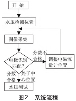 电磁流量计被运送到指定水压检测位置,接收到采集信号指令,系统开始对电磁流量计电极图像采集,并通过系统内部算法对图像进行矫正;紧接着对矫正过后的图像与模板图像进行识别匹配,并定位到图中ROI区域;最后得出识别匹配结果;若采集电极图像与模板图像匹配分数大于设定分数线表示电磁流量计处于中心位置,则驱动执行机构开始密封电极进行水压测试;若采集电极图像与模板图像匹配分数未达到合格线,则需要重新调整电磁流量计的位置重新进行图像采集,然后再进行电极模板匹配………如此循环。流程图如图2所示。