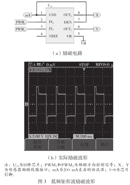1.传感器励磁电路传感器励磁方式所采用的矩形波励磁既可以大幅减少由直流励磁时产生的电极极化效应,使零点漂移变小,又可以克服正弦波励磁产生的正交干扰和同相干扰的影响,提高流量计零点的稳定性.矩形波励磁可分为低频矩形波励磁和高频矩形波励磁,低频方式励磁周期较长,会影响流量计的响应速度,适用于流体流速变化缓慢的场合,其精度较高.高频方式励磁周期较短,虽然响应速度快,但是产生的磁场稳定时间短,难以完全避免正交干扰的影响,其测量精度比低频方式低,适用于流体流速变化快和浆液噪声较大的场合,例如饮料的灌装和水泥浆流量的测量.该文采用5Hz的低频矩形波励磁,励磁电路和实际波形如图3所示.