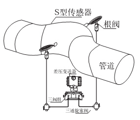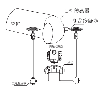 传感器的下方,使引压管中的气体排放回到管道中。如果现场条件是差压变送器必须安装在弯管传感器上方,则要求与根阀连接的引压管应先向下,然后缓变转弯向上,与差压变送器连接。