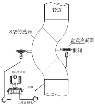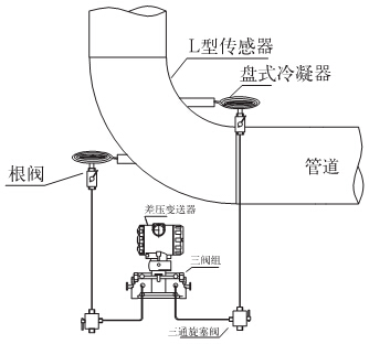 安装在弯管传感器的下方。盘式冷凝器的盘面要水平,与取压体在同一水平面上。